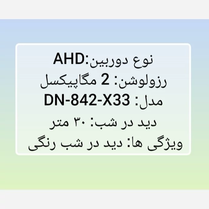 نوع دوربین:AHD رزولوشن: 2 مگاپیکسل مدل: DN-842-X33 دید در شب: 30 متر ویژگی ها: دید شب رنگی و اقتصادی