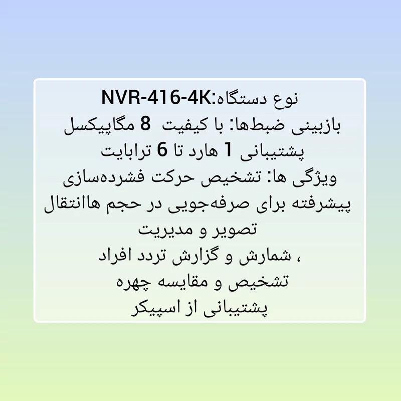 🔹 مشخصات اصلی دستگاه Preview : 16CH 4K امکان نمایش زنده همزمان 16 دوربین با کیفیت 4K (برای مانیتورینگ کامل یک مجموعه بزرگ) Playback : 1CH 4K / 2CH 5MP در حالت بازبینی: پخش 1 کانال با کیفیت 4K یا پخش همزمان 2 کانال 5 مگاپیکسل Hard : 1 Hard up to 6TB دارای 1 جای هارد با پشتیبانی تا 6 ترابایت (مناسب ضبط طولانیمدت) Output : HDMI, VGA خروجی تصویر: HDMI (تلویزیون و مانیتور جدید) VGA (مانیتورهای قدیمی) 🔹 امکانات نرمافزاری و هوشمند Motion Detection تشخیص حرکت و ضبط هوشمند (صرفهجویی در فضای هارد) H.264 / H.265 فشردهسازی حرفهای تصویر: کاهش حجم فایلها مصرف کمتر اینترنت کیفیت بهتر ضبط AFROOZSAZAN APP مشاهده تصاویر از راه دور با موبایل (اندروید و iOS) Passenger Flow Query قابلیت شمارش افراد مناسب فروشگاهها، مراکز تجاری و ادارات Face Capture & Comparison